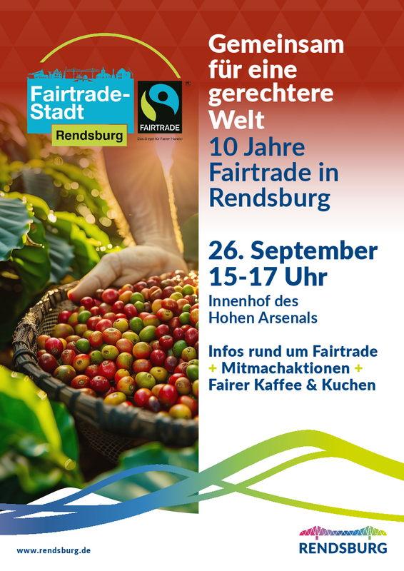 Anlässlich des Jubiläums sind alle Bürgerinnen und Bürger am Freitag, 26. September, herzlich zu einer Veranstaltung im Innenhof des Hohen Arsenals eingeladen. Von 15 bis 17 Uhr gibt es informative Stände, Mitmach-Aktionen, fairen Kaffee und Kuchen. Der familienfreundliche Nachmittag wird von der Steuerungsgruppe Fairtrade der Stadt Rendsburg in enger Zusammenarbeit mit der Fairtrade-AG des Helene-Lange-Gymnasiums organisiert.