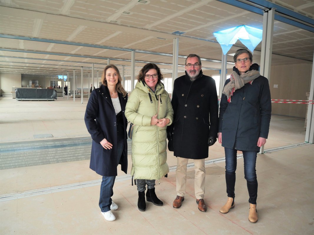 Auf dem Foto von links: Schulleiterin Rebecca Timmermann, Bürgermeisterin Janet Sönnichsen, Stadtpräsident Thomas Krabbes und Claudia Zimdars vom ausführenden Unternehmen Kleusberg. Das Foto wurde aufgenommen im Obergeschoss des Gebäudes.