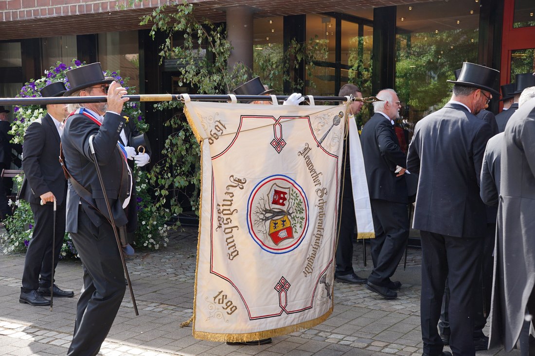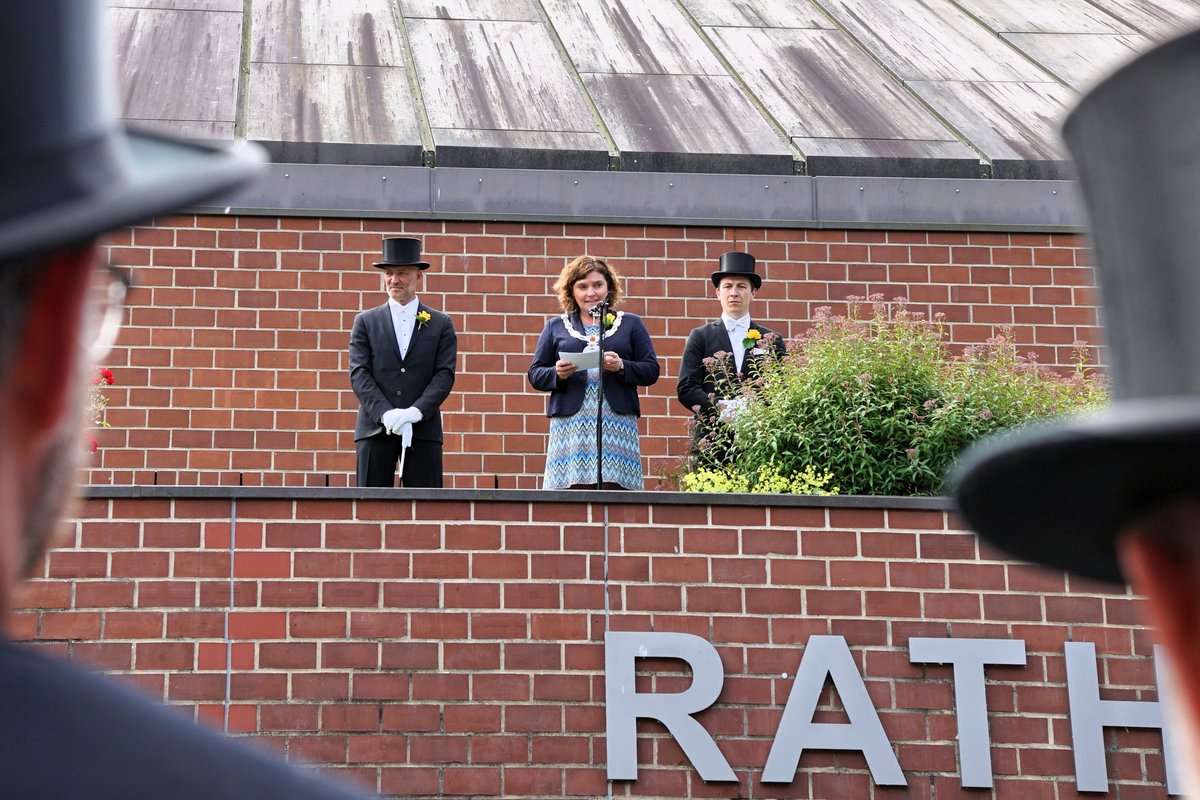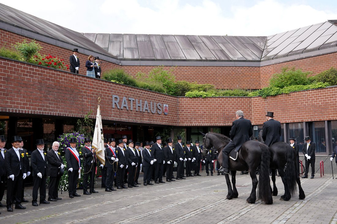 Der Gildetag der Neuwerker Scheiben-Schützen-Gilde findet traditionell am Montag nach Pfingsten statt – aktuell begeht die Gilde bereits ihr 333. Jahr. Ein fester Bestandteil des Gildetages ist der Besuch im Rendsburger Rathaus, bei dem die Mitglieder der Gilde die Bürgermeisterin Janet Sönnichsen in ihrem Büro abholen und gemeinsam auf den Balkon des Rathauses gehen.