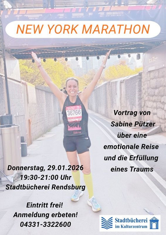 Am Donnerstag, 29. Januar, um 19:30 Uhr berichtet Sabine Pützer in der Stadtbücherei Rendsburg von ihrer Teilnahme am New York Marathon. Die in Nübbel lebende passionierte Läuferin hat sich im Herbst dieses Jahres mit 44 Jahren ihren Lebenstraum erfüllt. Als sie im Jahr zuvor eine Krebsdiagnose bekam, war für sie klar: „Wenn ich das überlebe, dann muss ich nach New York und dort den Marathon laufen!“ Anfang November war es dann soweit und unter dem Motto „once in a lifetime“ lief sie gemeinsam mit knapp 60.000 weiteren Teilnehmerinnen und Teilnehmern 42,195 Kilometer durch alle fünf Bezirke der Stadt, die niemals schläft, über die Ziellinie. In ihrem Vortrag nimmt sie die Besucherinnen und Besucher mit auf eine emotionale Reise von ihrem wahr gewordenen Traum in einer der faszinierendsten Städte dieser Welt.