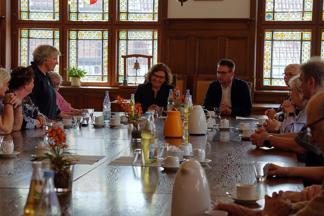 Der Seniorenrat der Stadt Rendsburg begrüßt für drei Tage seine Kolleginnen und Kollegen aus der Partnerstadt Rathenow. Bürgermeisterin Janet Sönnichsen hieß die Gäste am Dienstagmittag im Alten Rathaus willkommen: „Dieser Austausch ist wichtig, vor allem jetzt im Jahr unseres 35. Partnerschaftsjubiläums.“ Auch ihr Amtskollege Jörg Zietemann nahm an der Begrüßung teil. Er hatte es sich nicht nehmen lassen, den Seniorenrat persönlich nach Rendsburg zu chauffieren – bei bestem Sonnenschein.
