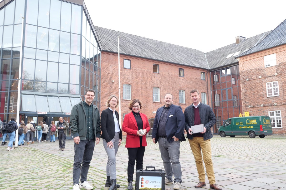 Foto 2 von links: Simon Radtke (Smarte KielRegion), Ulrike Schrabback (Geschäftsführerin KielRegion GmbH), Bürgermeisterin Janet Sönnichsen, Florian Lorenz (Fachdienstleiter IT Stadt Rendsburg), Matthias Behrens (SmartInfra).