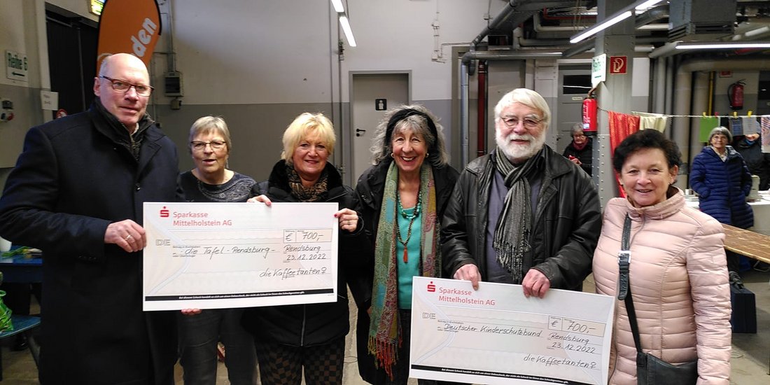 1400 Euro sind beim Kuchenverkauf an den Adventsfreitagen zusammengekommen. Am Tag vor Heiligabend erhielten der Ortsverband Rendsburg des Kinderschutzbundes sowie die Rendsburger Tafel jeweils einen Spendencheck über 700 Euro. Für diesen guten Zweck hatten die Händlerinnen und Händler des Wochenmarktes selbstgebackenen Kuchen und Fairtade-Kaffee verkauft.