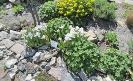 Alternativ kann der Schottergarten auch durch Einsaat in eine Blühfläche verwandelt werden. Auch hier sollte die Folie entfernt oder zumindest durchlöchert werden. Mit etwas Sand und torffreier Blumenerde wird in den Lücken zwischen den Steinen ein Saatbett vorbereitet. Dann kann die Aussaat mit einer Blühflächenmischung mit möglichst heimischen Wildstauden erfolgen.