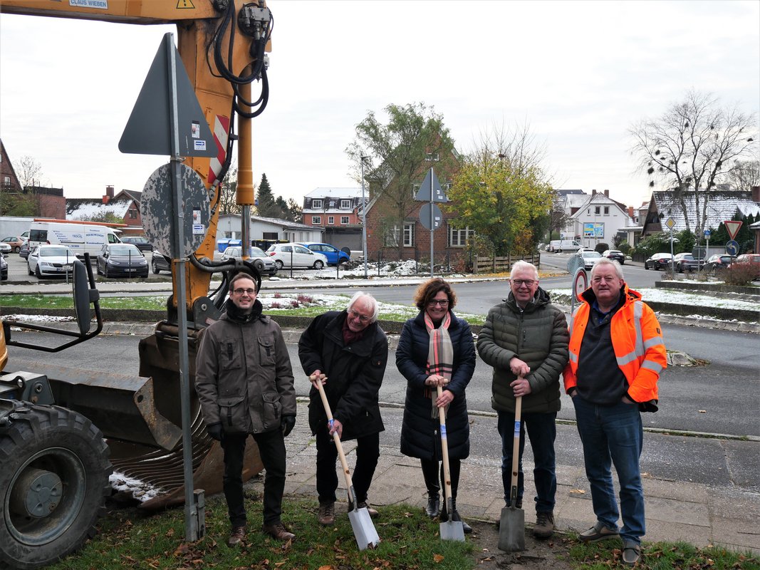 Auf dem Bild von links: Jan Köpnick-Stolz (Entwicklungsagentur), Fritjof Wilken (Umweltausschuss), Bürgermeisterin Janet Sönnichsen, Hans-Otto Schülldorf (Bürgermeister Westerrönfeld) und Bauunternehmer Kai Wieben.