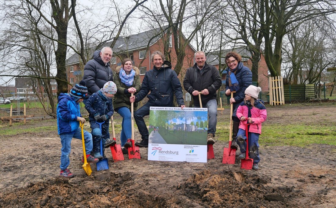 Bei Wind und Wetter erfolgte am Donnerstag, den 17. Februar 2022, der erste Spatenstich für den Neubau der Rendsburger Kindertagesstätte Butterberg II in der Schleswiger Chaussee.
