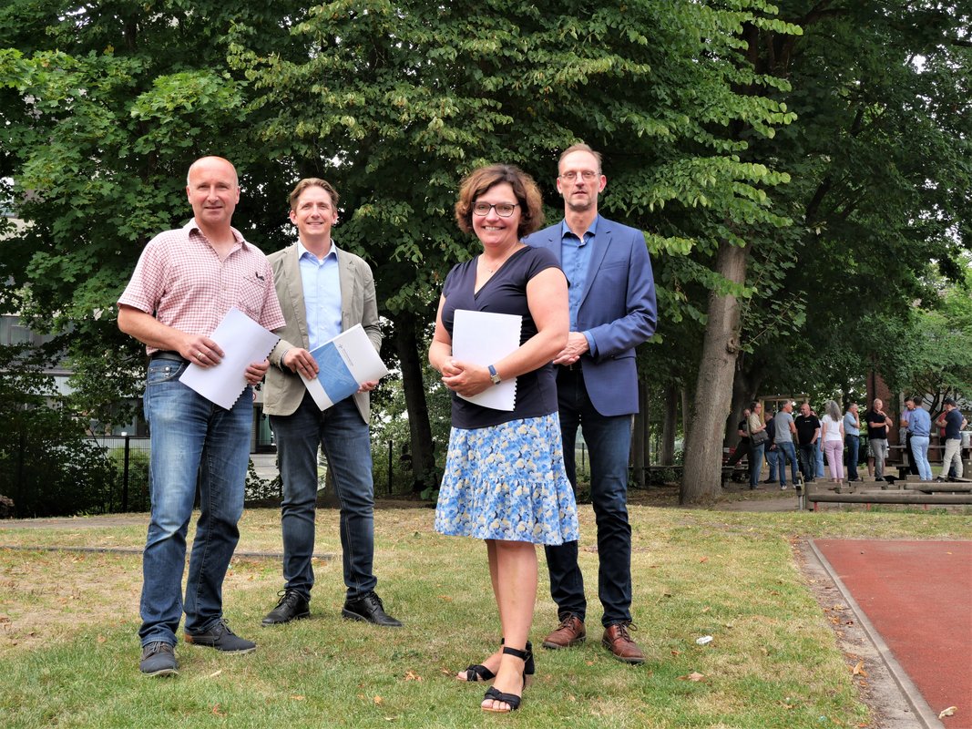 Baumgutachter Eckhard Zemke, Verkehrsplaner Marco Armgort, Bürgermeisterin Janet Sönnichsen sowie Schulleiter Gerhard Thomas