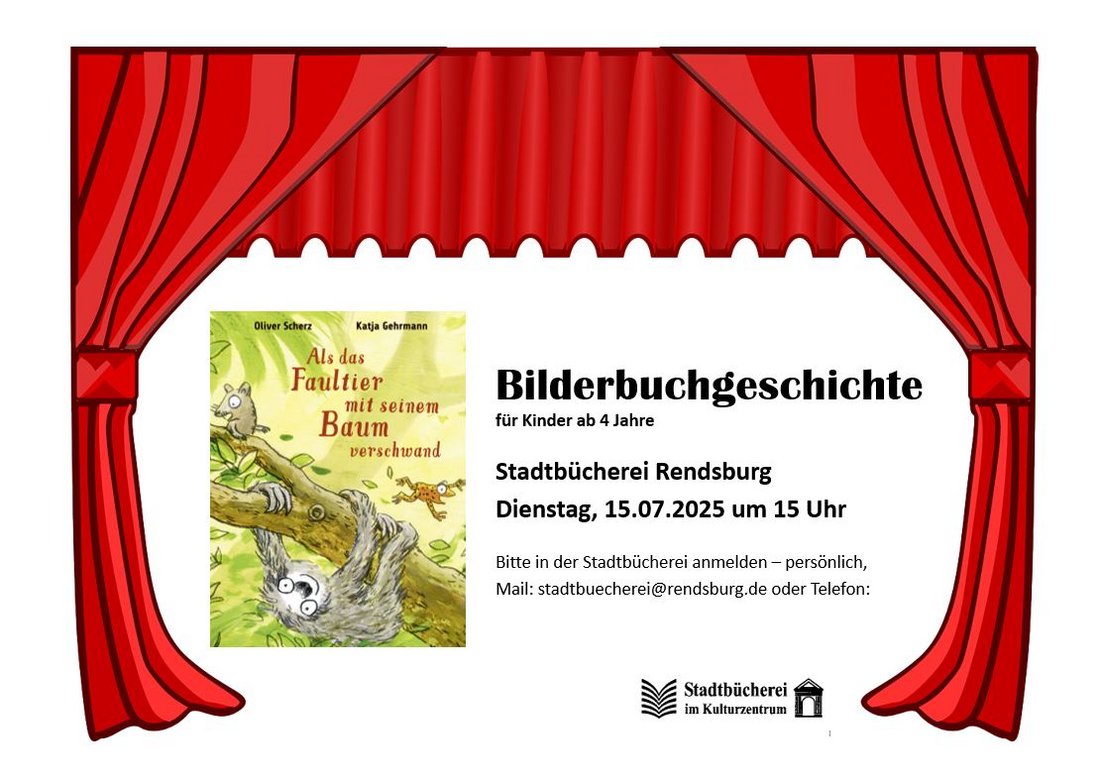 Die Bilderbuchgeschichte ist ein kostenfreies Angebot für Kita-Kinder ab 4 Jahren. Im Anschluss an die Geschichte gibt es Gelegenheit zum Basteln. Es wird um eine Anmeldung bei der Stadtbücherei persönlich, per E-Mail (stadtbuecherei@rendsburg.de) oder telefonisch unter 04331-3322622 gebeten. Aktuelle Termine und weitere Informationen der Stadtbücherei Rendsburg sind zu finden unter: rendsburg.bibliotheca-open.de/Veranstaltungen.