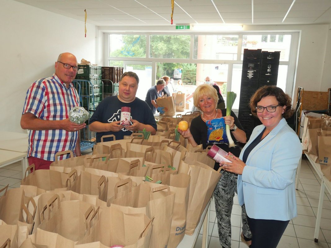 Tafel-Helfer Holger Glimm und Sven Nagel, Gitta Heinze (Leiterin der Tafel) und Bürgermeisterin Janet Sönnichsen