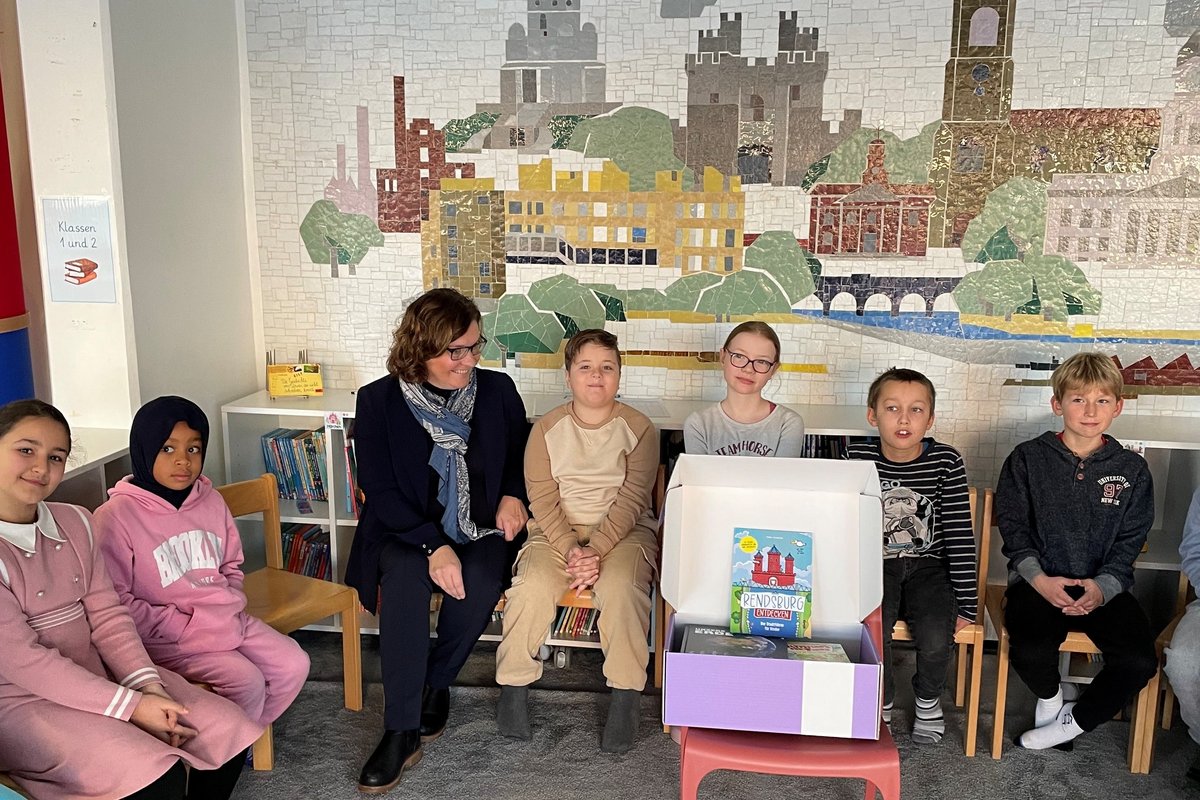 Im Anschluss an die Vorlesestunde überreichte Janet Sönnichsen eine Vorlesebox mit 21 ausgewählten Büchern als Geschenk an die Konrektorin Astrid Weidemann und die anwesenden Kinder in Vertretung für die ganze Schule.
