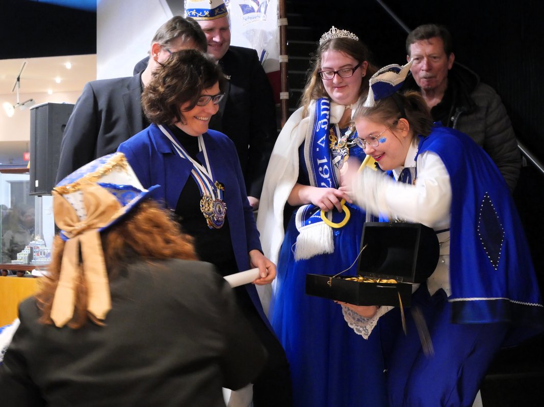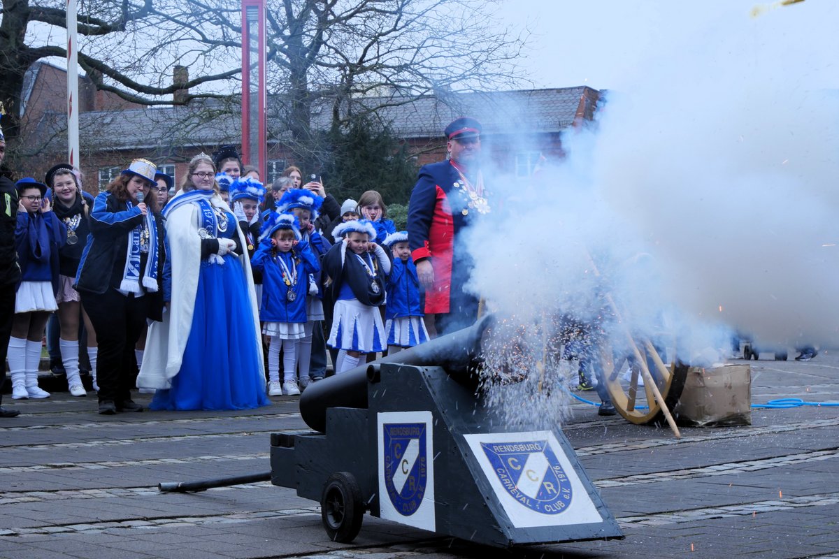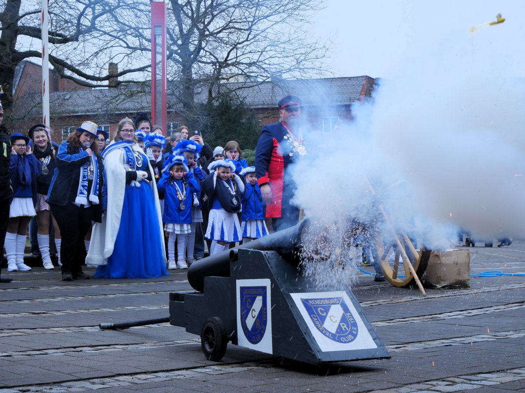 Einige Schüsse aus der Kanone waren am Sonntag vor Rosenmontag nötig. Erst dann ergab sich Bürgermeisterin Janet Sönnichsen und öffnete die Türen des Rathauses. Der traditionelle „Rathaussturm“ war aus Sicht der Karnevalisten erfolgreich verlaufen – brauchte allerdings etwas mehr Zeit und Vehemenz als im vergangenen Jahr. Erst nach fünf Kanonenschüssen konnten die Karnevalisten begleitet vom Musikkorps Rendsburg ins Foyer marschieren. „In diesem Jahr haben wir es nur fast nicht geschafft“, sagte Sönnichsen. Unterstützung beim Verteidigen der Stadtkasse sowie des Rathausschlüssels hatte sie an diesem Tag von einigen Vertretern aus der Kommunalpolitik sowie dem Geschäftsführer der Stadtwerke Bernd Reichelt erhalten.