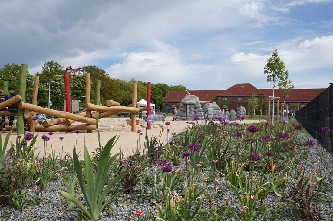 Zum Tag der Städtebauförderung, am 10. Mai, wurde in Rendsburg das neue Wohnquartier Neuwerk-West eröffnet. Auf dem Gelände der ehemaligen Eiderkaserne entsteht in zentraler, aber naturnaher Lage ein lebendiges Quartier für Jung und Alt. Während erste Einfamilienhäuser fertiggestellt sind und weitere Bauarbeiten laufen, wurde nun bei bestem Wetter der zentrale Spielplatz mit den Aufenthaltsbereichen, Holzliegen sowie der Trimm-dich-Pfad im nördlichen Bereich zur Nutzung freigegeben. Zahlreiche Interessierte kamen hierzu nach Neuwerk-West und nutzten außerdem die Gelegenheit, sich vor Ort über die weitere Entwicklung des Areals zu informieren.