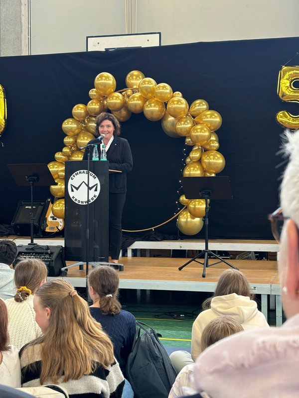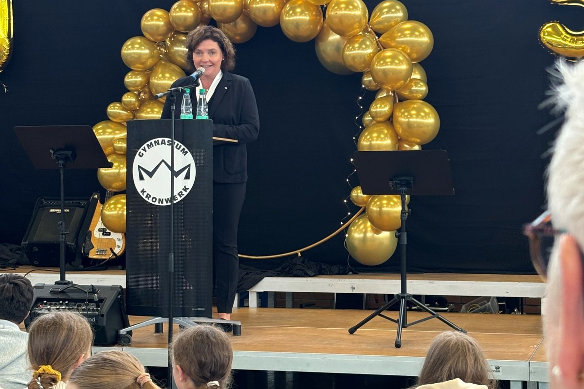 Das jüngste Gymnasium der Stadt Rendsburg feiert großes Jubiläum: Mit einer Festwoche begeht das Gymnasium Kronwerk seinen 50. Geburtstag und startete mit einem Festakt in diese besondere Woche. Die Eröffnung des Gymnasiums im Jahr 1974 bedeutete für die Stadt „schulpolitisch einen wichtigen Sprung nach vorn“, machte Bürgermeisterin Janet Sönnichsen in ihrer Rede während der Veranstaltung deutlich. „Wir bekamen unser drittes Gymnasium und konnten so dem gewachsenen Bedarf nachkommen.“ Das Gymnasium Kronwerk befindet sich seit 40 Jahren in Trägerschaft der Stadt Rendsburg und ist mit mehr als 650 Schülerinnen und Schülern nach dem Helene-Lange-Gymnasium die Schule mit der zweithöchsten Schülerzahl. Das Motto der Schule lautet „Miteinander leben und lernen“. Sönnichsen: „Und das wird hier kultur- und grenzübergreifend gelebt. Mit den Aktivitäten und Freundschaften zu Schulen in den europäischen Partnerstädten Rendsburgs trägt die Schule dazu bei, diese Städtepartnerschaften mit Leben zu füllen.“ Mit dem Lycée Marguerite Yourcenar in der französischen Stadt Le Mans wurde erst im vergangenen Winter eine neue Partnerschaft gegründet. „Die geschlossenen Freundschaften sind das Fundament Europas“, lobte Sönnichsen auch das Engagement der Schulgemeinschaft in der Stadt.