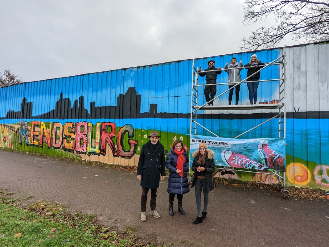 In der finalen Phase besuchte Bürgermeisterin Janet Sönnichsen die Künstler und Hobby-Künstler. „Hier ist durch gemeinsames Engagement etwas ganz Tolles entstanden – und dazu noch an wirklich prominenter Stelle. Fast jeder, der einen Bezug zu Rendsburg hat, kommt hier lang. Ich habe schon viel Positives aus der Stadtbevölkerung gehört, die Kinder und Jugendlichen können stolz auf sich sein.“ Auch Stadtpräsident Thomas Krabbes schaute vorbei. Er hat die Planungen von Beginn an mitgestaltet und den Akteuren Mut gemacht. „Es ist toll, dass dieses Projekt jetzt umgesetzt werden konnte. Klasse.“
