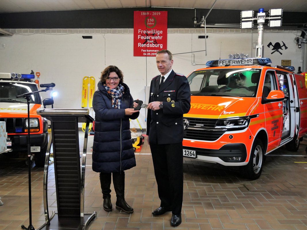 Die Freiwillige Feuerwehr der Stadt Rendsburg hat ein neues Einsatzfahrzeug in Dienst gestellt. Während einer feierlichen Fahrzeugübergabe händigte Bürgermeisterin Janet Sönnichsen nun den symbolischen Fahrzeugschlüssel an Wehrführer Martin Schuldt aus. In ihren Worten machte sie deutlich, wie vielfältig und herausfordernd sich das Aufgabenspektrum der Feuerwehr darstellt. „Und da werden wir als Stadt natürlich unseren verlässlichen Beitrag leisten. Nicht nur, dass die Kameradinnen und Kameraden heil und sicher aus dem Einsatz zurückkommen, sondern natürlich auch als Teil der kommunalen Sicherheitsarchitektur für unsere Bürgerinnen und Bürger. Dafür möchten wir die bedarfsgerecht beste Ausstattung bieten.“