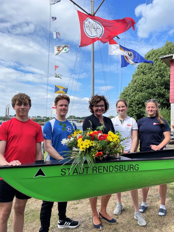 Auf dem Foto (von links): Max Scholz (Boot mitgebaut, seitdem Minijob bei ARROW Ruderbootsbau), Fynn Ehlers (Rendsburger Ruderverein e.V.), Bürgermeisterin Janet Sönnichsen, Janne Köster (Rendsburger Primaner Ruderclub) und Mia Bruhn (Ruderriege Helene-Lange-Gymnasium).