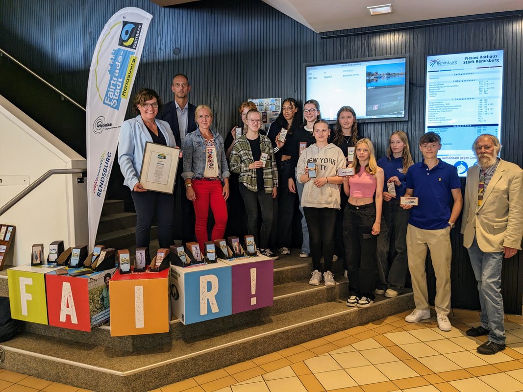 Die Stadt Rendsburg darf sich weiterhin Fairtrade-Stadt nennen und nimmt durch ihr Engagement für den fairen Handel vor Ort eine Vorreiterrolle ein. Am 12. Juli hat ein Empfang zur Titelerneuerung und Eröffnung der Vernissage mit der Bürgermeisterin Janet Sönnichsen, Henning Halver vom Weltladen, dem Schulleiter des Helene-Lange Gymnasiums Gerhard Thomas, den Lehrerinnen Christiane Zorenkov und Angela Gabriel sowie den Schülerinnen und Schülern des Helene-Lange-Gymnasium im Rathausfoyer stattgefunden.