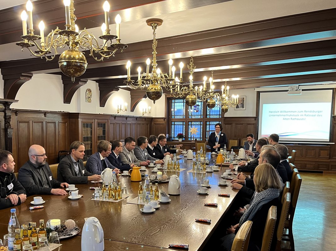 Bürgermeisterin Janet Sönnichsen hatte in der Vorweihnachtszeit die Rendsburger Unternehmerinnen und Unternehmer zum zweiten Unternehmerfrühstück des Jahres eingeladen. Sie eröffnete die Runde im Alten Rathaus mit der Vorstellung der zurzeit wichtigsten Bauprojekte der Stadt. Jörg Freudenreich, Fachbereichsleiter Bau und Umwelt, stellte im Anschluss das von der Stadt Rendsburg erarbeitete Integrierte Klimaschutzkonzept und einige daraus resultierende Projekte vor. Ein reger Austausch und eine spannende Diskussion folgten der Vorstellung. Abgerundet wurde der Vormittag durch eine lehrreiche und interessante Führung durch das Alte Rathaus. Hier konnte u.a. der Kerker besichtigt werden, der unter dem Trauzimmer gelegen ist. Das Unternehmerfrühstück ist ein wichtiger Austausch mit der Wirtschaft vor Ort, zu dem zweimal jährlich eingeladen wird.