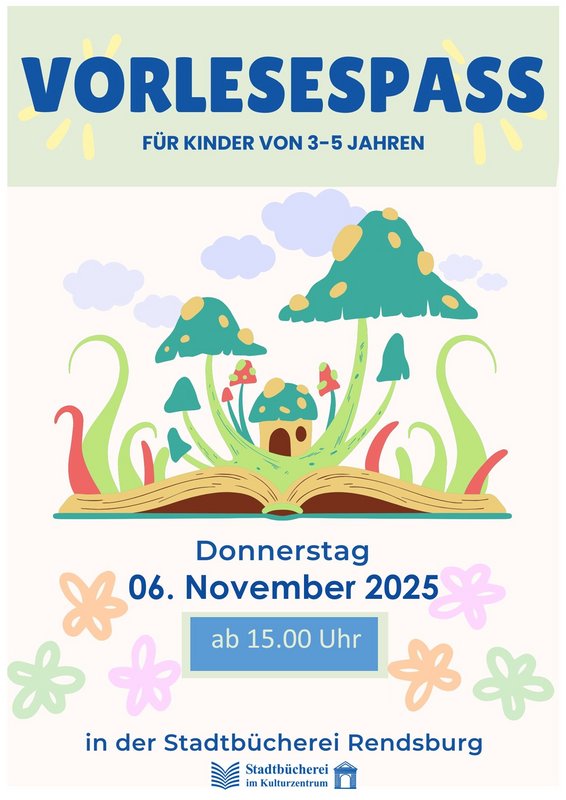 Der nächste Vorlesespaß der Stadtbücherei Rendsburg findet am Donnerstag, dem 6. November 2025 statt. Mit dem Erzähltheater „Kamishibai“ werden spannende, lustige und bunte Geschichten vorgetragen. Das kostenfreie Angebot beginnt um 15.00 Uhr und ist für Kinder zwischen 3 und 5 Jahren gedacht. Es ist keine vorherige Anmeldung notwendig. Aktuelle Termine und weitere Informationen der Stadtbücherei Rendsburg sind zu finden unter: rendsburg.bibliotheca-open.de/Veranstaltungen