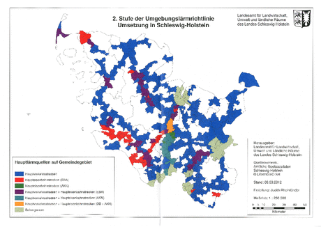 Mit der Änderung des Bundes-Immissionsschutzgesetzes 2005 ist die Umsetzung der EU-Richtlinie von 2002 über die Bewertung und Bekämpfung von Umgebungslärm in deutsches Recht erfolgt. Demnach sind in erster Stufe u.a. Orte in der Nähe von Hauptverkehrsstraßen mit einem Verkehrsaufkommen von über 6 Mio. Kfz/Jahr verpflichtet, Lärmkarten zu erstellen. Diese Lärmkarten wurden vom Land Schleswig-Holstein 2007 flächendeckend unter https://danord.gdi-sh.de/viewer/resources/apps/umgebungslaeramatlasgeoportal/ bzw. www.laerm.schleswig-holstein.de veröffentlicht. In den Jahren 2012 und 2013 ist dies mit erweitertem Umfang in einer zweiten Stufe zu wiederholen und anschließend alle fünf Jahre zu überprüfen. Die Fristen für die Aufstellung von Lärmkarten und Lärmaktionsplänen in Stufe 1 und 2 sind folgender Übersicht zu entnehmen: