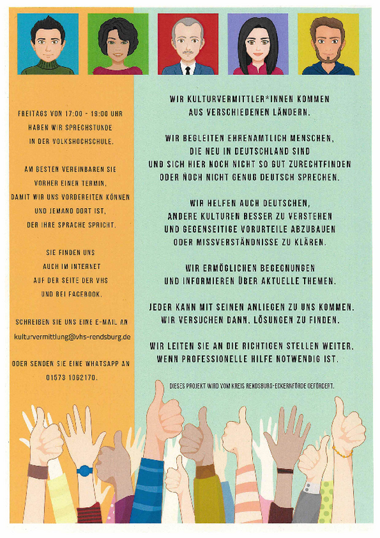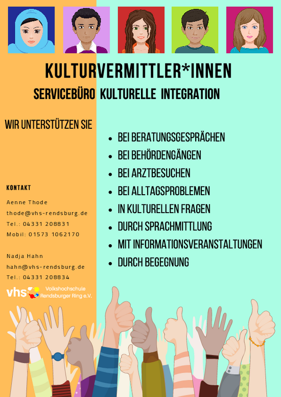 Gerne steht das Servicebüro Kulturelle Integration Freitag von 17:00 - 19:00 Uhr in der Volkshochschule Rendsburg für weitere Informationen zur Verfügung.