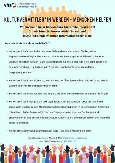 - Kulturvermittler*innen helfen ehrenamtlich anderen Menschen. Sie begleiten Migrantinnen und Migranten, die sich alleine noch nicht gut zurechtfinden oder kein Deutsch sprechen können. Zum Beispiel gehen sie mit ihnen zum Arzt, zum Jobcenter, zu einer Beratung, zur Polizei, zur Zuwanderungsbehörde oder zu anderen Gesprächsterminen.