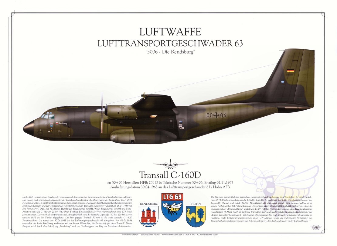 Seit dem 06.06.1994 verbindet die Stadt Rendsburg eine Patenschaft zur Transall C-160 „Rendsburg“ beim Lufttransportgeschwader LTG 63 auf dem Flugplatz Hohn. Die Maschine hat viele Hilfs- und UN-Einsätze in die verschiedensten Länder geflogen. 2012 ist sie Außerdienst gestellt worden und in ihre Einzelteile zerlegt worden. Die Platte mit dem Stadtwappen und dem Namenszug Rendsburg wurde aus dem Rumpf geschnitten und wird zusammen mit dem Gästebuch der Maschine der Stadt Rendsburg für die militärhistorische Sammlung übergeben.